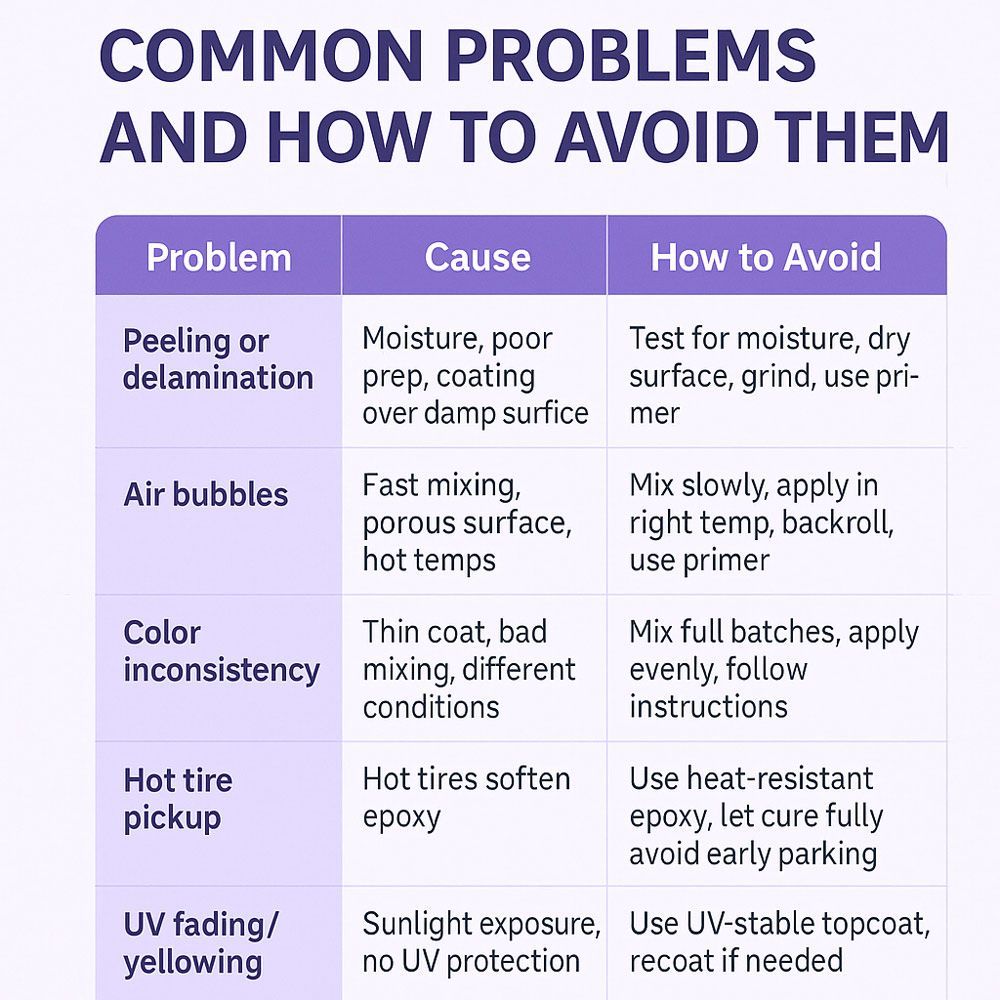 | Hot tire pickup | Vehicle tires hot causing epoxy to soften and lift underneath | Use epoxy with high heat resistance, allow full cure before parking, avoid parking immediately after finish |