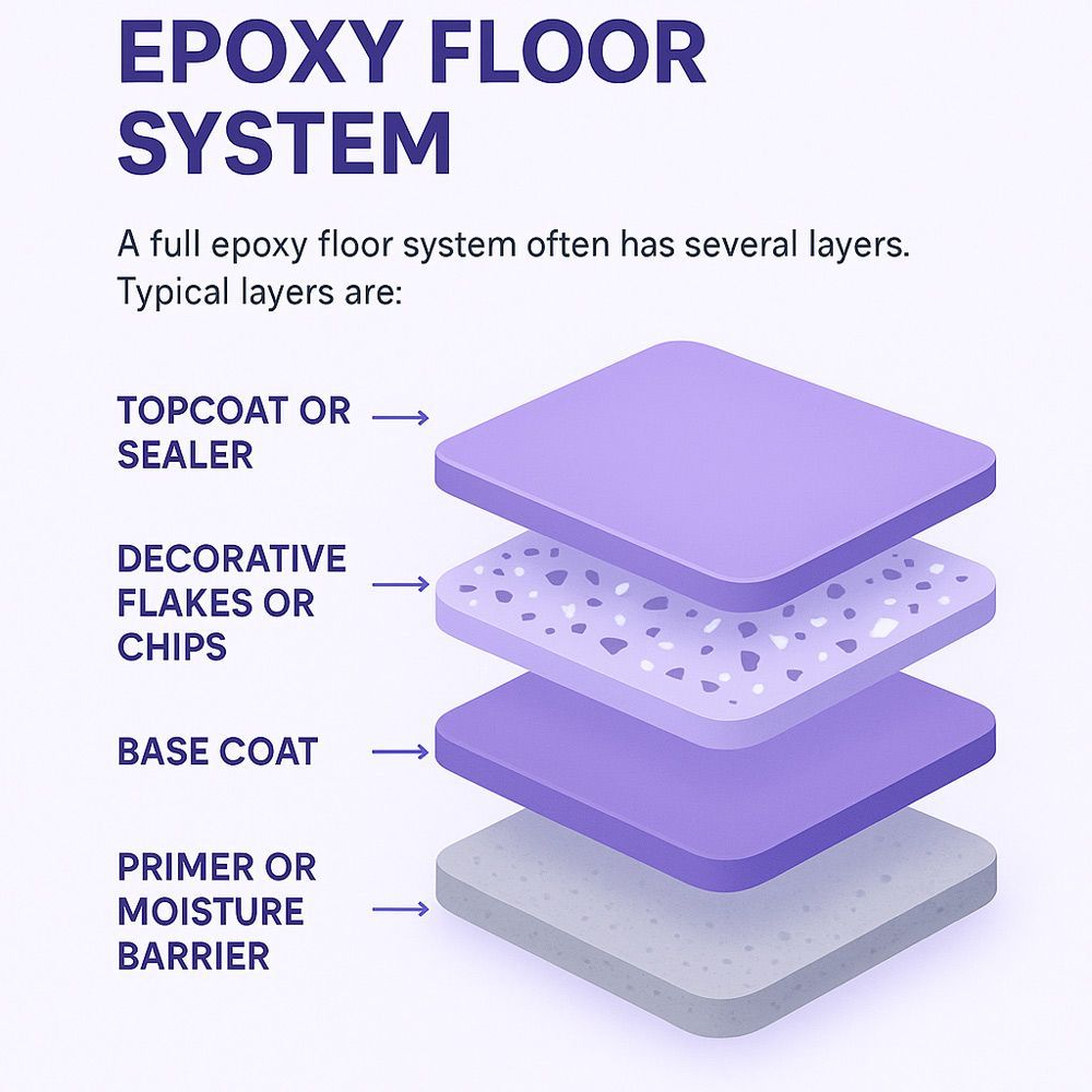 - A full epoxy floor system often has several layers. Typical layers are: primer or moisture barrier, base coat, decorative flakes or chips if you want, then a topcoat or sealer. Additives like slip resistance or UV stabilizer may be included.