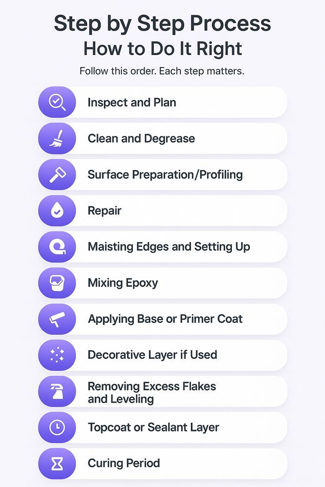 | Peeling or delamination | Moisture in concrete, poor prep, applying epoxy too soon over damp surface | Do moisture testing, allow surface to dry, use proper primer, ensure good profile via grinding |